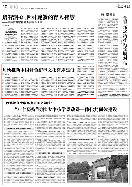 当前,建设中国特色新型智库已经成为一项重大而紧迫的任务。其中,文化智库建设不容忽视。中国特色新型文化智库是文化领域推进科学决策的重要支撑、建设现代治理体系的重要内容和国家软实力的重要体现,广大社会科学研究工作者肩负着推动文化繁荣、建设文化强国、建设中华民族现代文明新的文化使命。新时代以来,随着文化强国战略的持续推进,各类文化智库加速发展,文化智库建设的作用和意义也不断凸显。一大批中国特色新型文化智库快速发展,通过创新性思想输出,为党和政府决策提供了有力的智力支持,为坚定文化自信、提升文化软实力、增强中国在文化建设与国际交往中的话语权作出重要贡献,取得的成绩有目共睹。