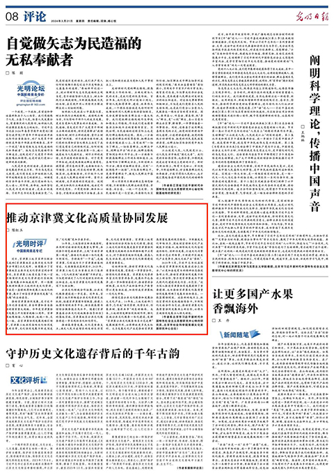 推动高质量发展,文化是重要支点;满足人民日益增长的美好生活需要,文化是重要因素。京津冀三地有着相似的社会风俗与文化特质,推进三地文化协同发展是落实京津冀协同发展重大战略的具体举措和题中应有之义,对于推动区域协同发展、提高人民生活品质,进而助力文化强国建设具有重要意义。
