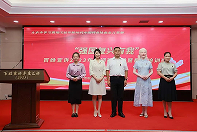 8月6日,为期三天的北京市“强国复兴有我”百姓宣讲2023年度调研汇讲暨骨干培训班圆满收官,来自全市各区各系统19个代表队的95名宣讲员共话身边小事、时代大事和发展要事,进一步强化“围绕时代重大主题主线、善用身边人讲身边事的形式、做好最新理论政策解读和社会主义核心价值观培育”的北京百姓宣讲模式。市委宣传部副部长张际,北京市社科院党组书记谢辉和副院长、市委讲师团团长肖峻峰出席本次活动并为荣获优秀宣讲员、优秀短视频和优秀宣讲团的成员和团队颁奖。