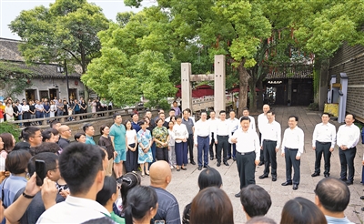 7月5日至7日,中共中央总书记、国家主席、中央军委主席习近平在江苏考察。这是6日上午,习近平在苏州平江历史文化街区,同当地居民和游客亲切交流。