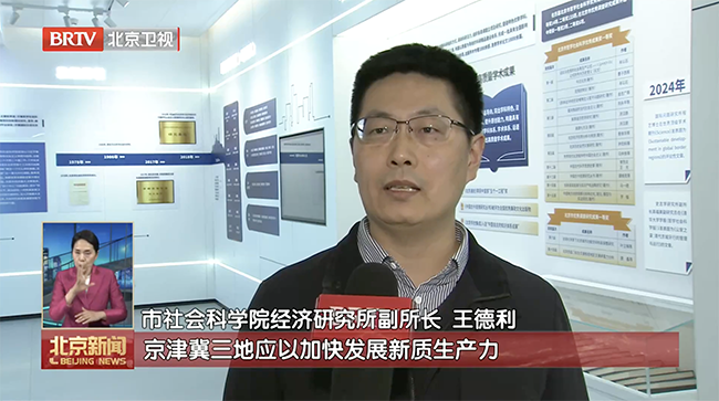经济研究所副所长王德利研究员接受北京卫视《北京新闻》采访,围绕"十五五"时期京津冀协同发展与产业创新进行解读。他表示,"十五五"时期京津冀三地应以加快发展新质生产力,协同构建现代化产业体系作为主要目标,以共建北京(京津冀)国际科技创新中心为引领,共同推进重点产业链关键核心技术的联合攻关,推动更多的北京科技成果能在京津冀转化落地。