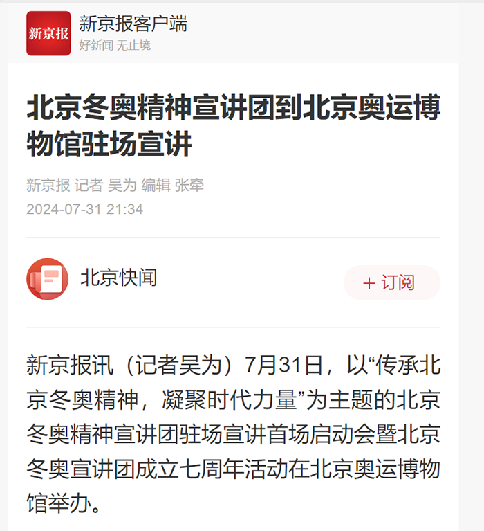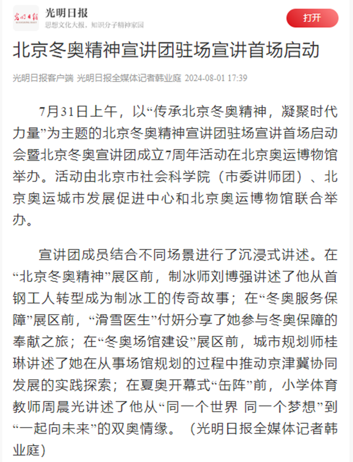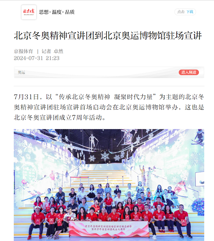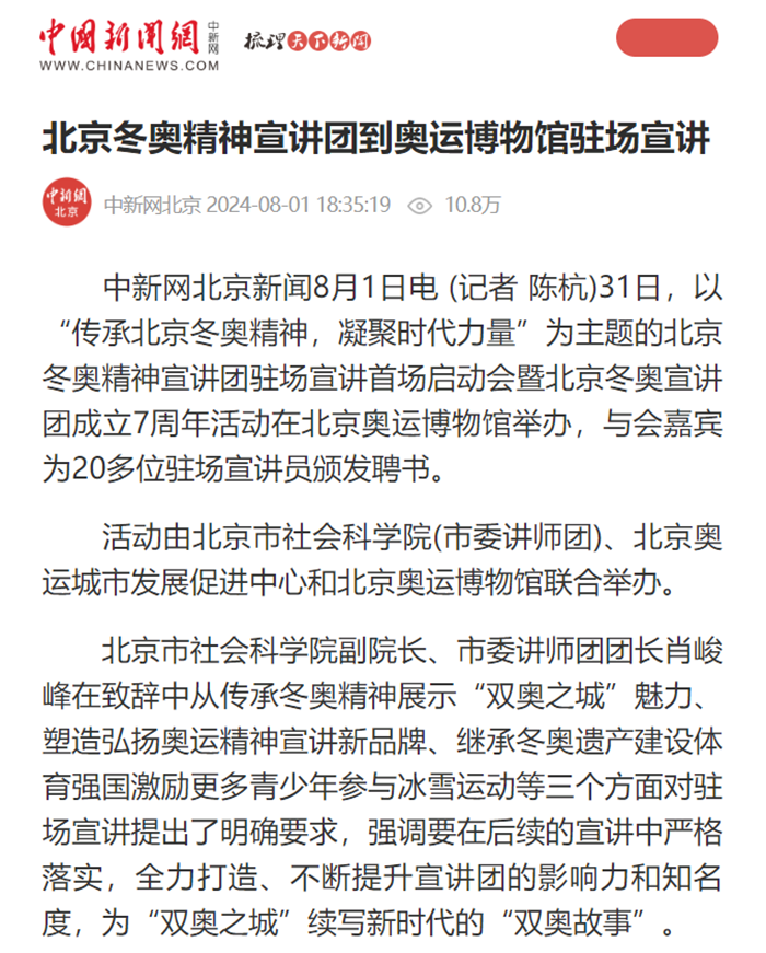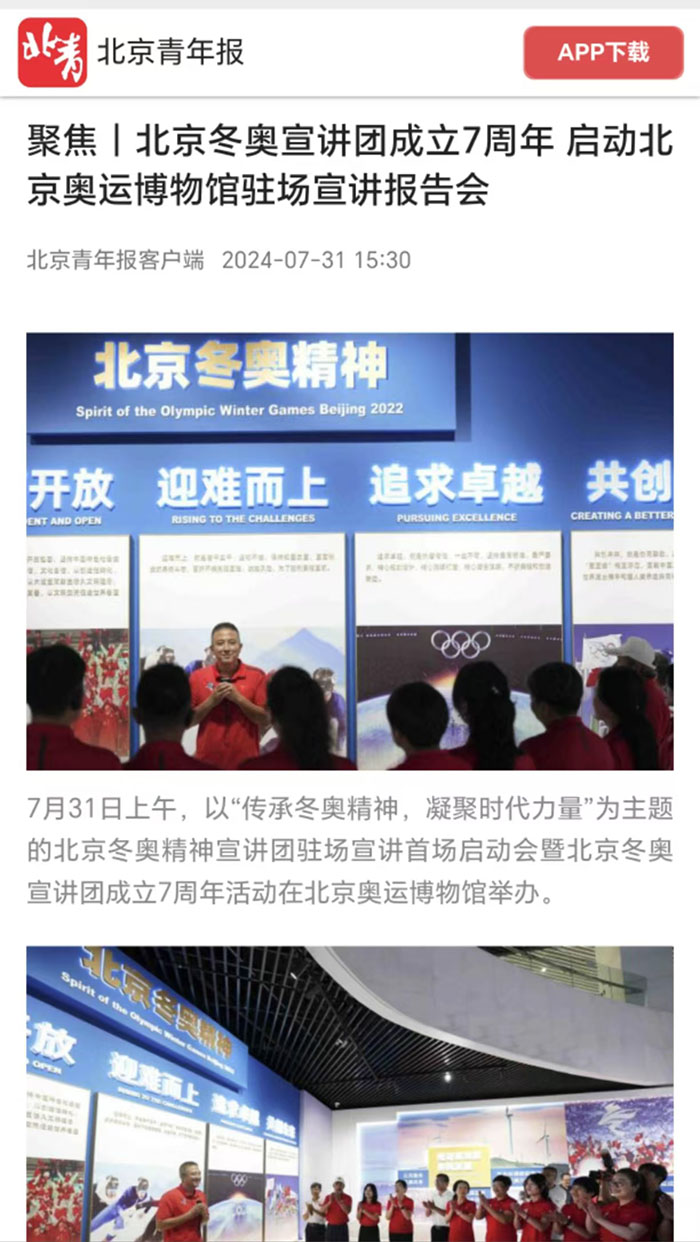 7月31日上午,以“传承北京冬奥精神,凝聚时代力量”为主题的北京冬奥精神宣讲团驻场宣讲首场启动会暨北京冬奥宣讲团成立7周年活动在北京奥运博物馆举办。活动由星天地娱乐城 (市委讲师团)、北京奥运城市发展促进中心和北京奥运博物馆联合举办。多家主流媒体进行了详细宣传报道。