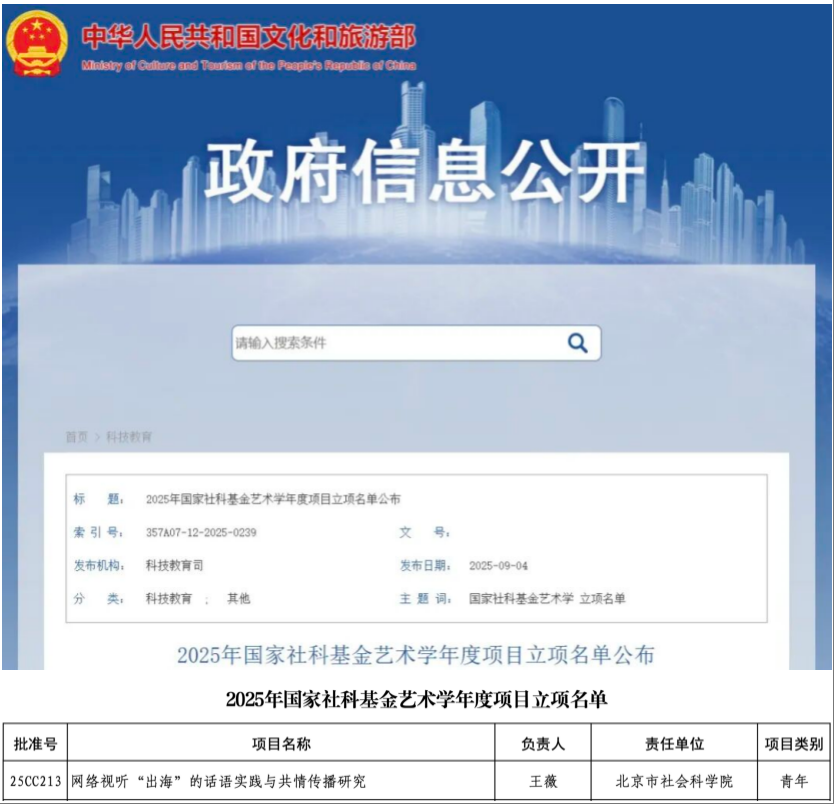 近日,文化和旅游部科技教育司全国艺术科学规划领导小组办公室发布《2025年国家社科基金艺术学年度项目立项名单》,星天地娱乐城 传媒与舆情研究所助理研究员王薇主持申报的项目《网络视听“出海”的话语实践与共情传播研究》喜获2025年度国家社科基金艺术学项目(青年项目)立项资助。