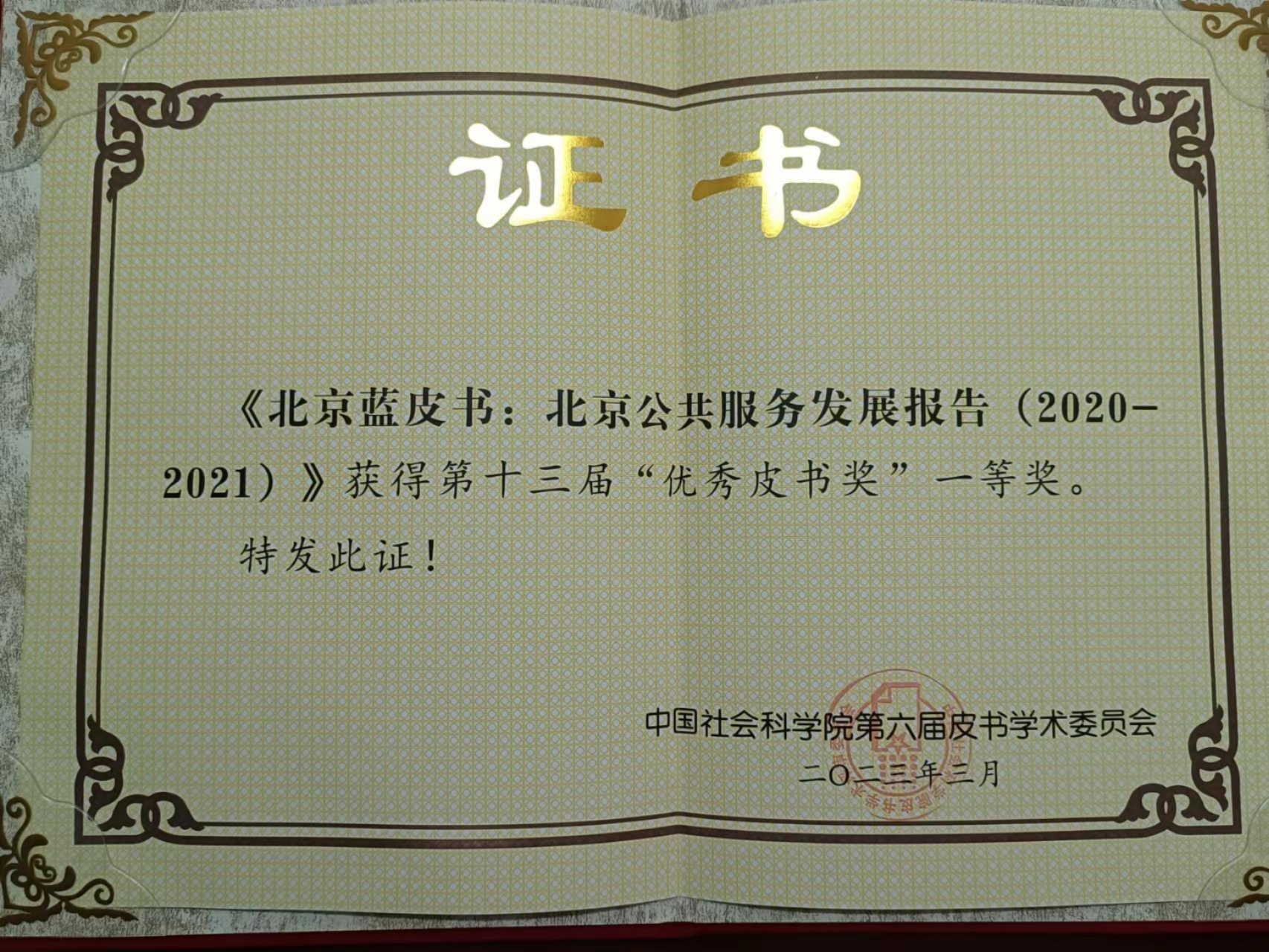 《北京公共服务发展报告(2020-2021)》获得 第十三届“优秀皮书奖”一等奖