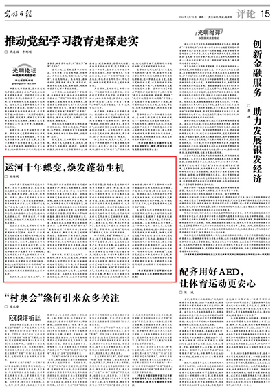 2024年是中国大运河申遗成功十周年。习近平总书记指出,大运河是祖先留给我们的宝贵遗产,是流动的文化,要统筹保护好、传承好、利用好。十年来,在以习近平同志为核心的党中央领导下,沿岸各地坚持保护、传承和发展的宗旨,大运河得以“美起来”“活起来”,成为更好连接过去与未来的精神纽带,成为中华文明的传承之河、生机勃勃的生态之河、造福人民的幸福之河。千年大运河,十年精彩蝶变,古老运河正焕发出崭新的生机与活力。