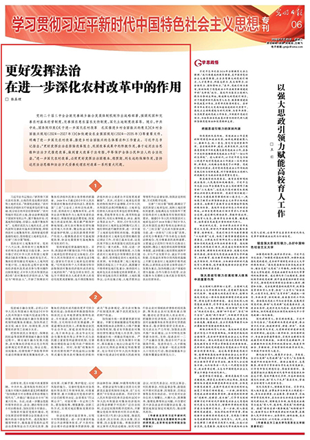党的二十届三中全会就完善城乡融合发展体制机制作出战略部署,强调巩固和完善农村基本经营制度,完善强农惠农富农支持制度,深化土地制度改革等。随后,中共中央、国务院印发《关于进一步深化农村改革 扎实推进乡村全面振兴的意见》《乡村全面振兴规划(2024—2027年)》《加快建设农业强国规划(2024—2035年)》等重要文件,明确了进一步深化农村改革、推进乡村全面振兴的总体要求和工作重点。习近平总书记指出:“更好发挥法治在排除改革阻力、巩固改革成果中的积极作用,善于运用法治思维和法治方式推进改革,做到重大改革于法有据,平等保护全体公民和法人的合法权益。”进一步深化农村改革,必须更好发挥法治固根本、稳预期、利长远的保障作用,坚持运用法治思维和法治方式妥善处理农村改革一系列重大问题。