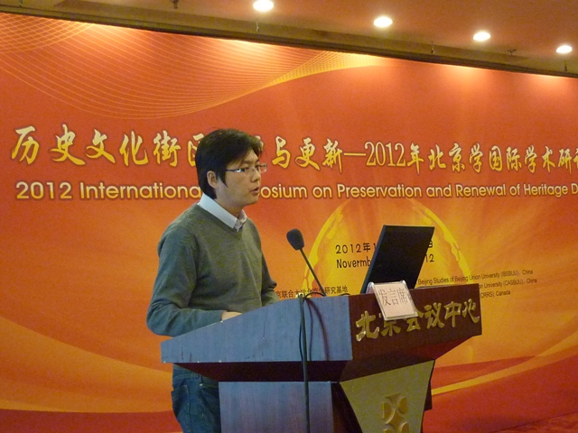 2012年11月20日,本所王建伟副研究员在北京会议中心参加了由北京联合大学北京学研究基地与北京联合大学应用文理学院、加拿大文化更新研究中心、加拿大道格拉斯学院联合举办的“历史文化街区保护与更新——2012年北京学国际学术研讨会”,并作主题发言。