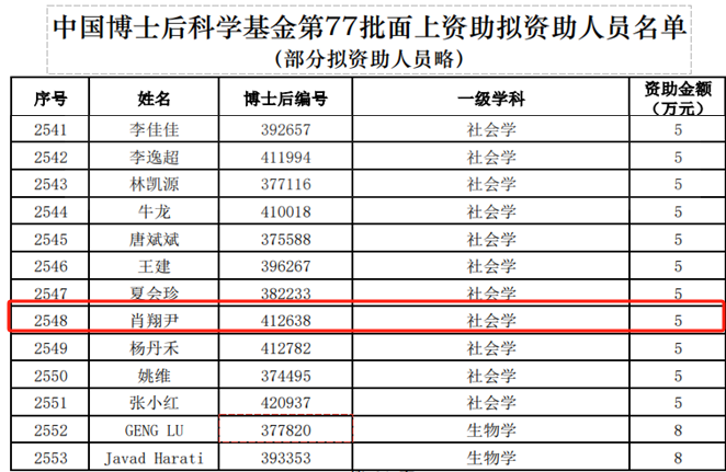社会学所博士后肖翔尹获中国博士后科学基金第77批面上资助