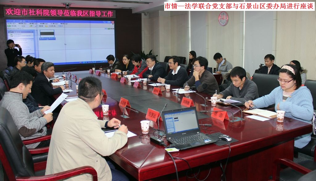 对石景山区的大力支持表示感谢;石景山区发改委副主任吴琨简要介绍了石景山区经济社会发展的近况,对石景山区的CRD(首都文化娱乐休闲区)功能定位进行了说明,并对今后石景山区的空间布局与产业发展做了详细的分析;石景山区经信委副主任吕志刚就首都高端产业服务区建设情况进行了介绍。唐主任代表市情-法学联合党支部感谢石景山区党委、区政府对这次党支部活动的高度重视,他表示党支部成员要加强理论与实践结合力度,加强走转改力度,走近基层、走近实践、走近北京社会经济运行的第一线,通过各种合作方式支持石景山区的发展。