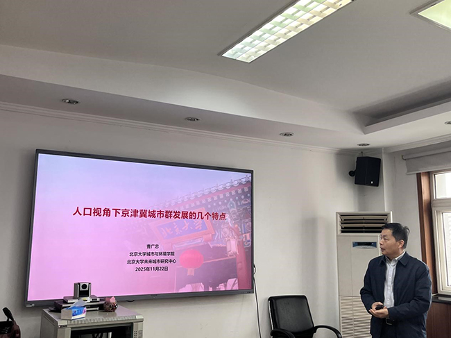 紧接着,北京大学环境学院曹广忠教授以《人口视角下京津冀城市群发展的几个特点》为题,从研究背景、总体态势和空间特征等方面展开交流。他指出,京津冀协同发展从2014年2月便上升为国家发展战略,在《京津冀协同发展规划纲要》中确定了"功能互补、区域联动、轴向集聚、节点支撑"的布局思路。当前,京津冀协同发展进入新篇章,要发挥北京"一核"辐射带动作用,以快捷高效的现代化交通体系为支撑,加快建设定位清晰、梯次布局、协调联动的现代化首都都市圈,推动形成京津冀城市群主干构架。他认为,人口规模和结构变动及迁移流动、空间再分布是区域发展动态的重要表征,产业和交通是影响人口以及人才迁移流动的关键因素。人口变动背景下,京津冀出现人口空间结构重构迹象。然而,京津冀地区整体具有人才优势,但不显著且对人口吸引力略有下降,相较于长三角和珠三角,人口增长动力较弱。从外来人口流向来看,外来人口主要流向北京、天津和廊坊三地,天津和浪费是承接北京人才外溢的主要地区。