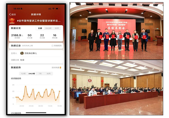 三是“百姓身边事儿”微博号发布信息179条,总阅读量1.081亿次,其中:宣讲家杯总结表彰暨全市宣传宣讲工作会话题阅读量2188.9万;学习贯彻习近平文化思想百姓宣讲京津冀三地联合宣讲启动仪式微博话题阅读量2896.6万,当日热搜榜排名第18位;学习贯彻习近平文化思想“理论+百姓+文艺”特色宣讲首场报告微博话题阅读量2512.8万;学习贯彻习近平文化思想“理论+百姓+文艺”特色宣讲西城专场报告微博话题阅读量3084.7万。