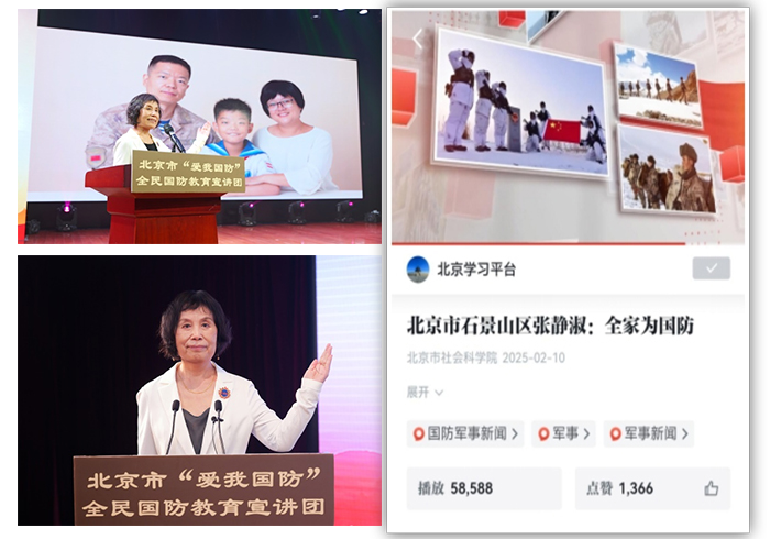 一是学习强国“北京宣讲”专题共发布内容172条,总阅读量131.16万。其中“爱我国防”百姓宣讲团张静淑宣讲的《全家为国防》被“学习强国”平台收录进军事频道。