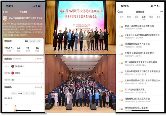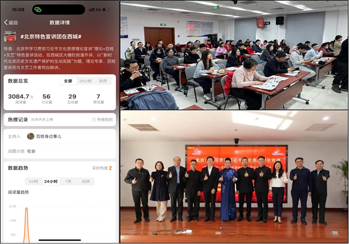 三是“百姓身边事儿”微博号发布信息179条,总阅读量1.081亿次,其中:宣讲家杯总结表彰暨全市宣传宣讲工作会话题阅读量2188.9万;学习贯彻习近平文化思想百姓宣讲京津冀三地联合宣讲启动仪式微博话题阅读量2896.6万,当日热搜榜排名第18位;学习贯彻习近平文化思想“理论+百姓+文艺”特色宣讲首场报告微博话题阅读量2512.8万;学习贯彻习近平文化思想“理论+百姓+文艺”特色宣讲西城专场报告微博话题阅读量3084.7万。