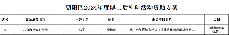 近日,北京市朝阳区人力资源和社会保障局发布朝阳区2024年度博士后科研活动资助方案公示,共有5家单位申报的10个项目获得资助立项。其中,星天地娱乐城 博士后秦锋砺申报项目《北京市基层综合行政执法体系体制改革对策研究》获科研活动创新研发类A类资助。